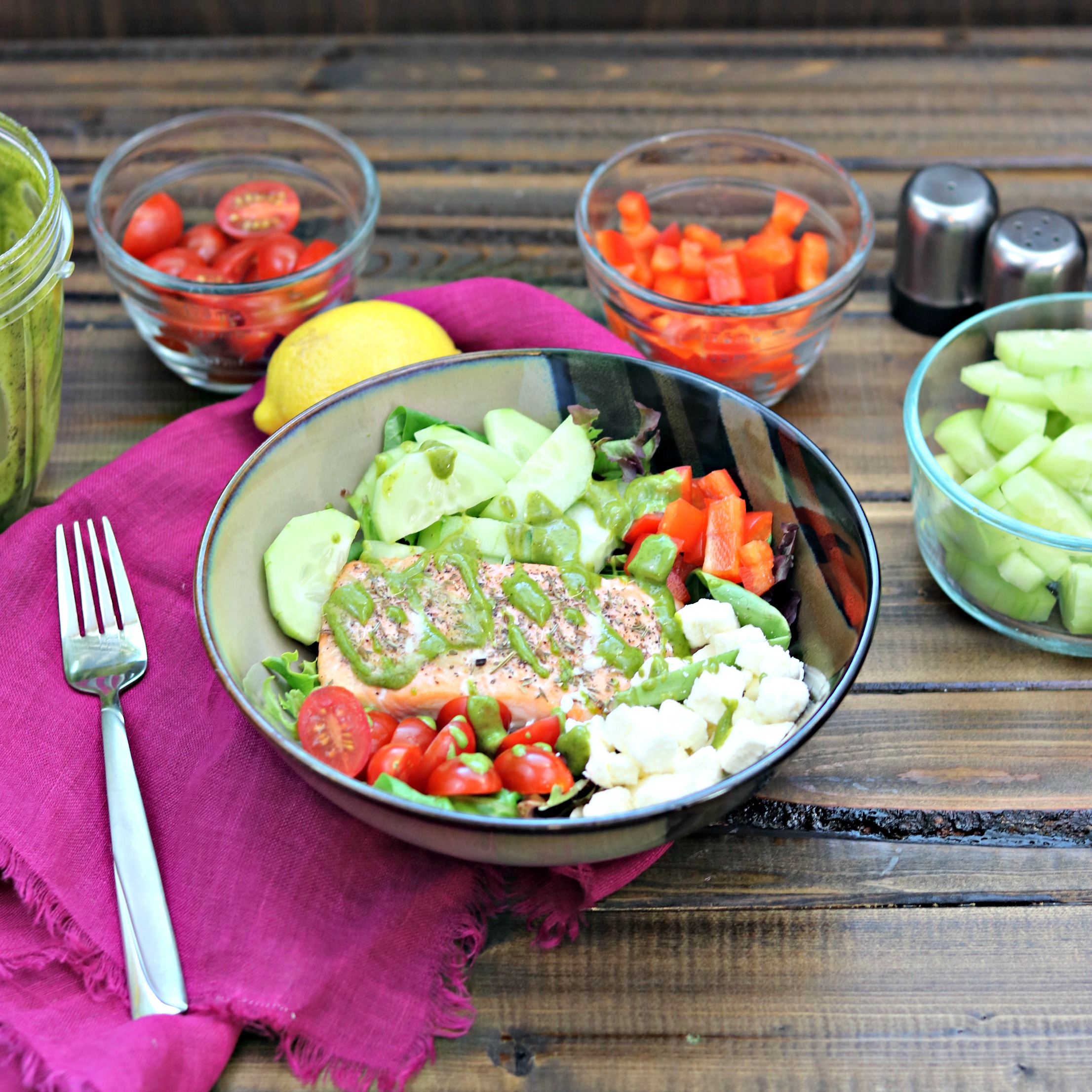 - Salmon Greek Salad with Lemon Basil Vinaigrette