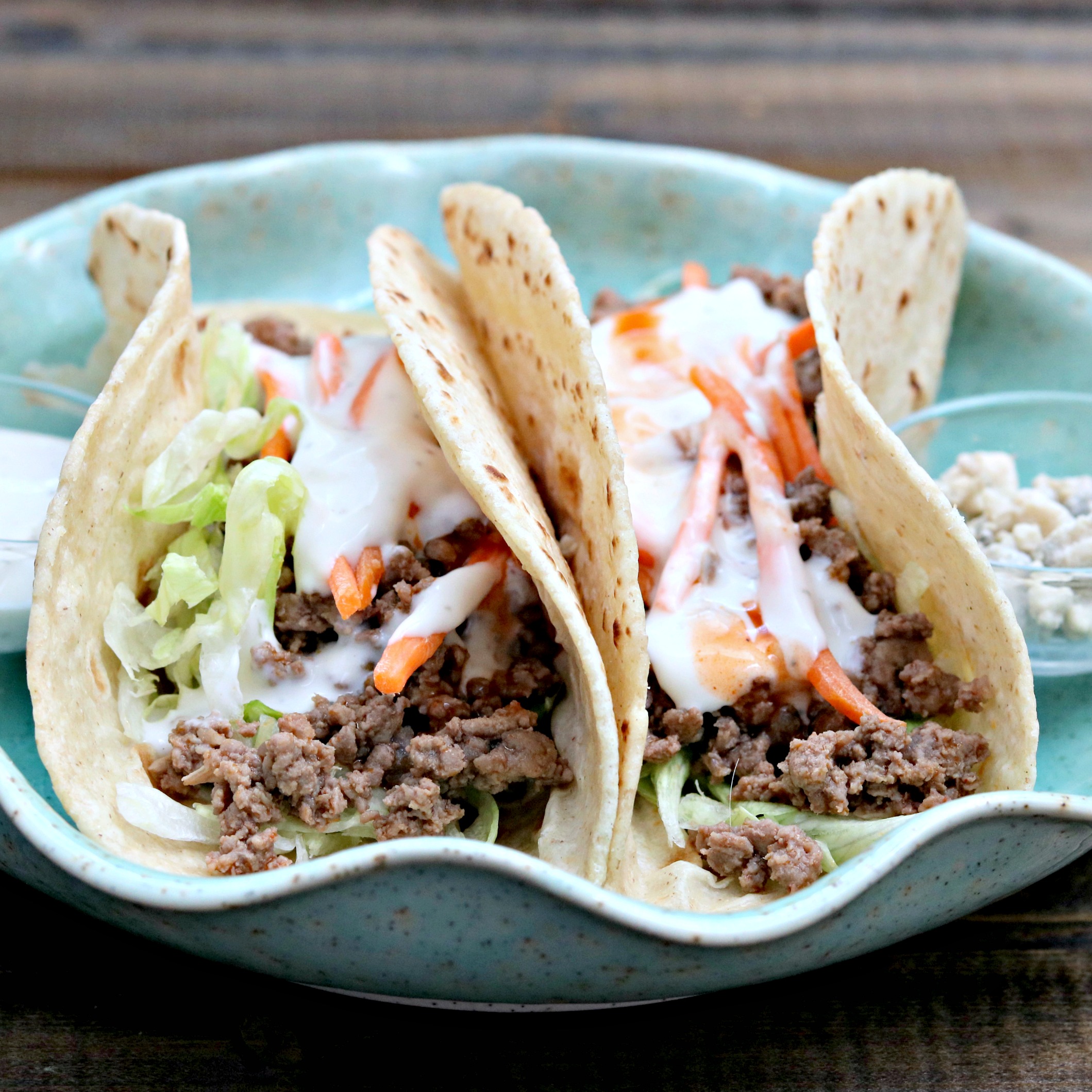 J and I really love our food spicy, and we like a lot of sauce, so I definitely pour it on thick, so-to-speak. If you aren’t as inclined to a lot of sauce or super spicy, you can still enjoy these tacos. Just start off with a lesser amount of buffalo sauce, and adjust to desired level.